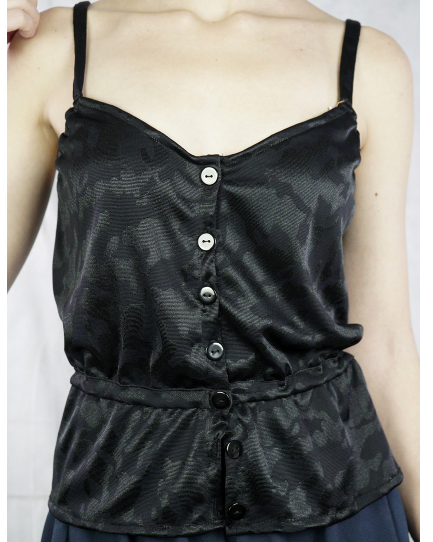 El top wika es fresquito para el verano pero también lo puedes llevar en primavera con una rebeca. El largo del top wika es hasta la cintura con una goma elástica alrededor de la misma para que se adapte a varias tallas, además crea el efecto fruncido y abombado que es característico de la prenda. Por la parte delantera tiene una abertura con botones del mismo color que el resto de la prenda. El género de la blusa es sintético, muy liviano y fresquito, de color negro azulado. Tiene múltiples posibilidades, es ideal para llevarlo tanto con tejano de tiro alto, pantalón corto o falda. La prenda tiene unos tirantes finos pero resistentes. El tejido escogido es de género nuevo, sin estrenar ni usar antes. Está confeccionado con la técnica del Zero Waste, que aprovecha la tela al máximo para evitar despedicios y desechos de género. El tejido es sintético reaprovechado de otras prendas que apenas se han usado, lo que se conoce como técnica de upcycling. Como es regulable y elástico, la talla del top wika puede adaptarse entre XS-L.